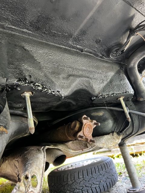 Now that we got a lot of the weight of the sub frame it should be easier to manipulate it down. In my case two front bushings were so shot that when removing the two nuts holding them on. The inner bushing sleeve came with the bolt and nut. Rears were a lot easier as they just unbolted fairly easily.
