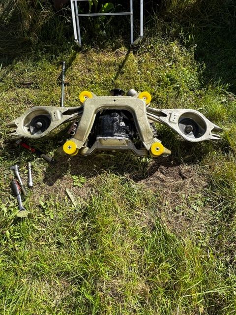 First I started by removing all the easier components of the drive train. Such as brake discs, calipers, handbrake cables, driveshaft and axles. After these were removed I took out the longitudinal arms. This made removing the sub frame it´s self a lot more easier as this whole project was done on a driveway. A little tip for you guys, rear brake calipers aren´t required to be disconnected from their hoses just undo two 10mm bolts from longitudinal arm and you can get them out of your way. This way you don´t have to bleed the system after re-install.