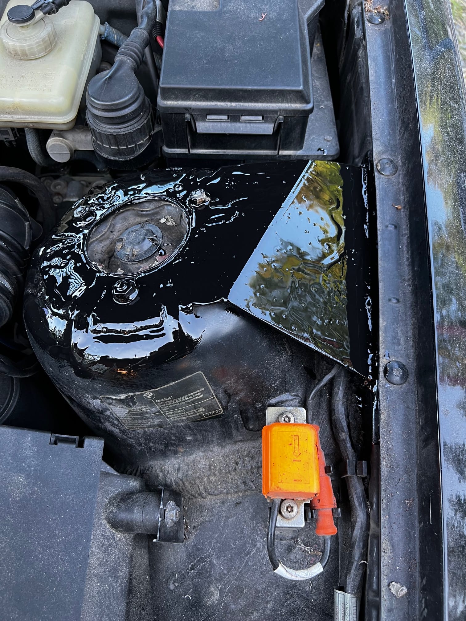Once both re-enforcements were fully welded. I let them cool down slowly. Removed all protection from engine bay and checked few times that no sparks had gotten past them. Once they were fully cooled down I gave them few coats of black paint. First coat was laid quite runny to make sure all possible little holes would be filled between chassis and re-enforcement plates to prevent rust from forming later.