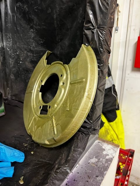 Now if you are like me and are doing both bearings and brake shields, it´s two 10mm bolts and two 14mm bolts. Then you can use some brute force to get the old brake shield off from the car, and do a comparison to make sure you have the correct part. (if you are unsure of your part being the same, don´t paint it before you are sure!)