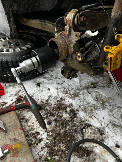 Now you have your caliper off. Next I grabbed a 30mm 12-point socket and removed the driveshaft nut on the wheel flange, this can be quite thight as it was in my case. Needed 1/2" breaker bar to get enough torque to get it off. Next go under the car or if you have access to air tools grab 12mm torx and few long 1/2" extensions so you can remove the six torx bolts holding drive shaft to diffenrential flange. When these have been removed you notice that you need to also drop rear swaybar to get the driveshafts out. So grab your 13mm socket and corresponding spanner and remove swaybar to subframe mounting bolts. After this you can drop your axles out from differential side first then slide them off from the hubs.