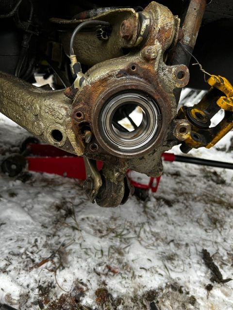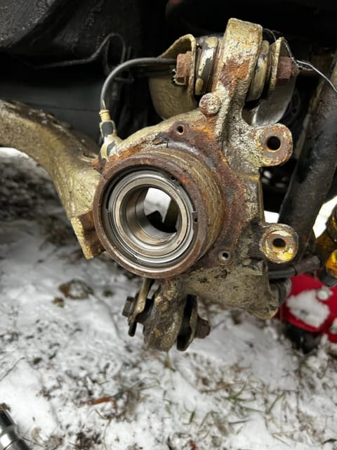 When the bearing is successfully out, clean the surface with for example scotchsbrite and get ready to re-install new bearing. I also blasted my drive flanges at this point with soda to remove some corrosion, but this is optional. When pressing bearing back to it´s place. make sure you have the cup on the other side, and that it clears the abs-sensor, so it wont break while pressing the bearing back. On the bearing side make sure you have large enough disc to properly press the bearings outer race, pressing against the inner race at this point may damage your new bearing! Make sure you seat the bearing fully to make installing the locking ring a lot easier. it should almost fall in place after being compressed into it´s hole. No hammer needed at this point.