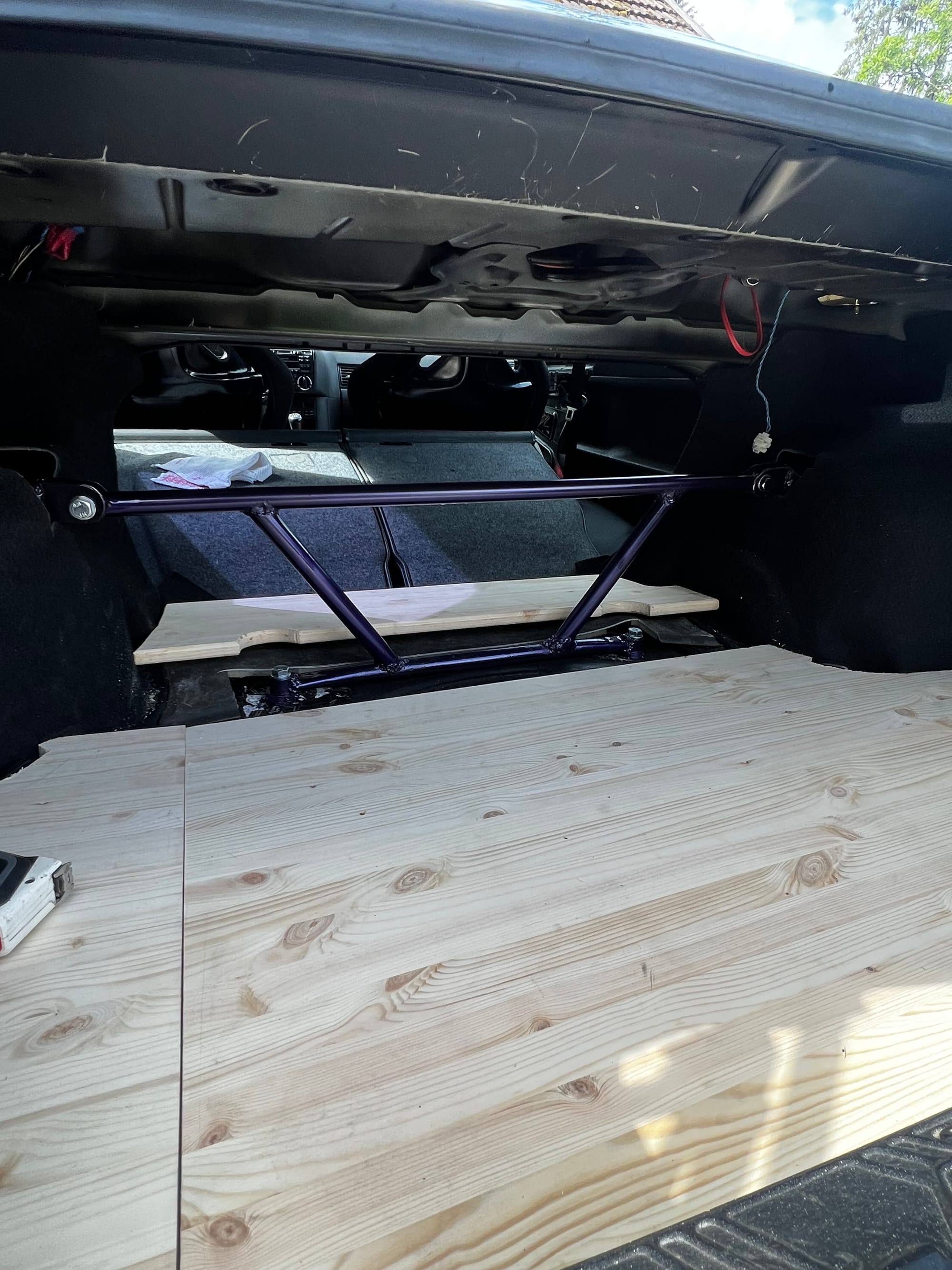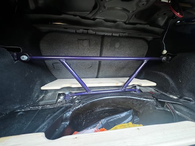Solution for this for me was to build custom one off brace that would tie together both rear strut mounts and also rear subframes two back mounting points. This brace is made from 20mm x 1,5mm steel tube. Design being some what triangulated. This is also just first prototype and more streamline and stiffer brace will be made in near future to replace this one.